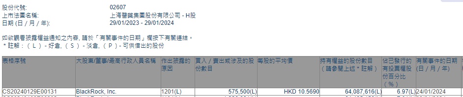 智通财经APP获悉,香港联交所最新资料显示,1月24日,贝莱德减持上海医药(02607)57.55万股,每股作价10.569元,总金额约为608.25万港元。减持后最新持股数目约为6408.76万股,最新持股比例为6.97%。