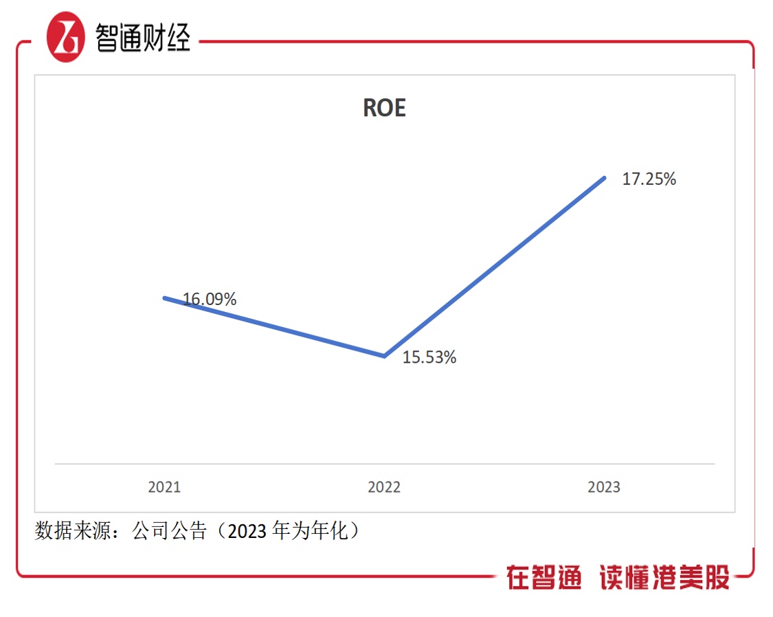可以观察到,该公司的业绩基本无视经济周期,保持了稳健的业绩提升,这也恰恰说明了凭借龙头的地位,能够在弱市环境中强者恒强。而由于经营业绩持续提升,该公司的ROE回报率水平远超同行,年平均超过16%,2023年年化为17.25%,此外,其积极回馈股东,近三年派息水平稳定在30%水平。