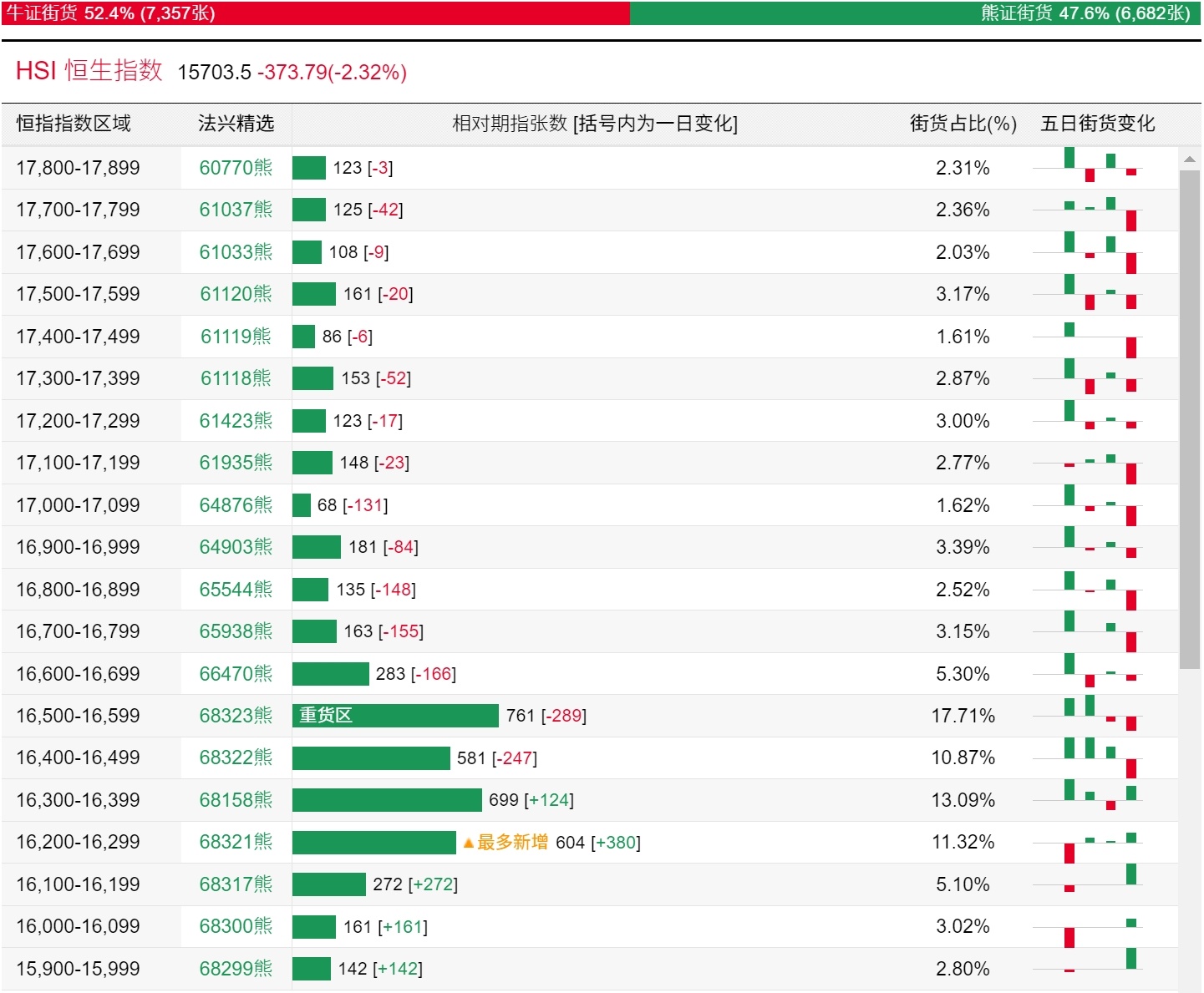 法兴恒指牛熊证街货分布图中的数据显示,熊证街货重货区在16500-16599区间,该区间最新熊证数量为761张,较上一交易日减少289张;最多新增在16200-16299区间,该区间最新熊证数量为604张,较上一交易日增加380张。