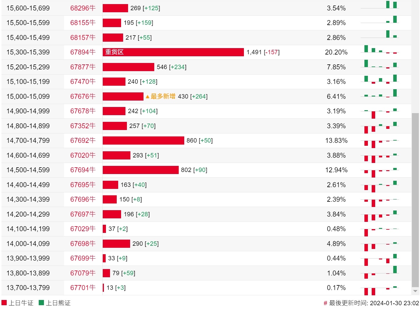 牛证街货重货区在15300-15399区间,该区间最新牛证数量为1491张,较上一交易日减少157张;最多新增在15000-15099区间,该区间最新牛证数量为430张,较上一交易日增加264张。