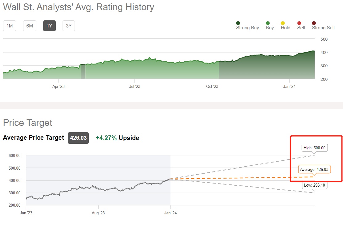 Seeking Alpha汇编的华尔街分析师共识评级以及目标价显示,华尔街分析师们对微软的共识评级为“强力买入”,平均目标价预期则高达426.03美元这一历史新高,最高达600美元。