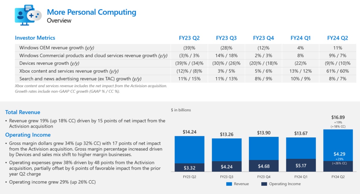 微软Q2更多个人计算业务部门(More Personal Computing)营收则上升至169亿美元,同比增约19%,略高于分析师预期。该部门目前包含Windows操作系统、Surface硬件、Xbox游戏机,以及收购后的电子游戏制作公司动视暴雪。据市场研究公司Gartner Inc.的统计数据,第四季度全球个人电脑销量实现同比增长0.3%,为两年来首次同比增长,表明全球PC需求正在企稳。