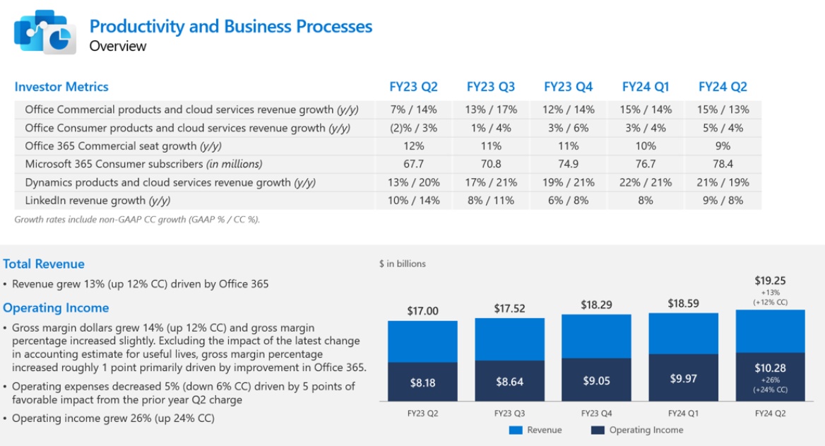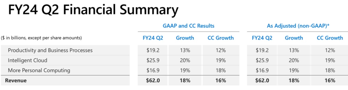 微软其他重要业务部门方面,在企业版Microsoft 365 Copilot以及面向企业端用户的Office云服务在第二财季付费用户数量超过4亿大关推动之下,微软Q2旗下商业端云产品(Commercial cloud product)总营收同比增长24%,至337亿美元。在2023年11月1日,微软向企业端客户广泛发布了企业版的Microsoft 365 Copilot,这是一款用于Outlook、Word、PowerPoint和Teams等Office系列核心应用软件的人工智能助手,售价为每用户每月在现有Microsoft订阅的基础上额外每月支付30美元。有分析人士表示,微软企业版Microsoft 365 Copilot有朝一日可能成为一个非常有意义的经常性营收来源。