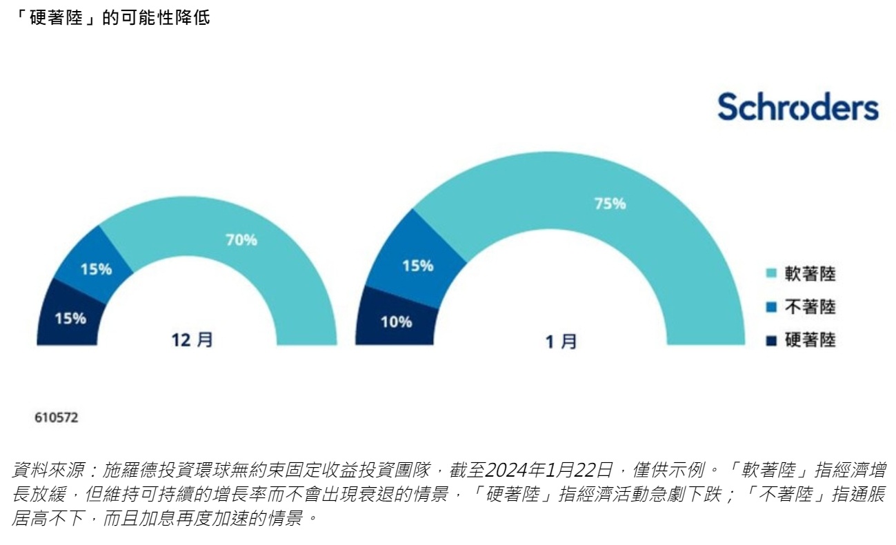 智通财经APP获悉,1月30日,施罗德投资环球无约束固定收益投资团队发文称,虽然经济“硬着陆”的风险尚未完全消失,但通胀前景大幅改善和金融条件放宽(使消费者及企业的财务状况更为轻松),另外有迹象显示,关键领先指标(银行贷款是其中一项)回稳,这促使该行下调经济硬着陆发生的可能性。