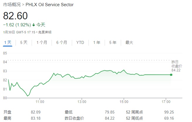 美国油服行业大幅下挫,费城石油服务业指数一度跌5.2%,创2023年10月4日以来最大盘中跌幅,收跌1.9%。斯伦贝谢(SLB.US)周二美股盘中一度跌近10%,贝克休斯(BKR.US)、Seadrill (SDRL.US)均收跌逾2%,哈里伯顿 (HAL.US)跌超1%。