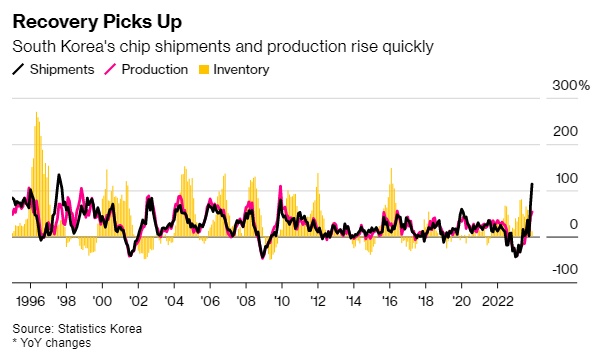 韩国统计局周三发布的数据显示,芯片出货量同比大幅增长113.7%,库存增长11.6%,为2022年末以来的最小增幅。另外,产量同比增长53.3%,为2016年年中以来的最高水平。