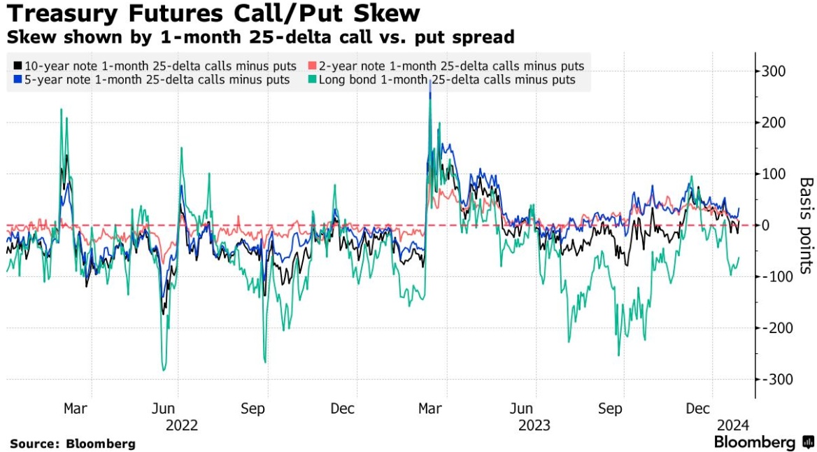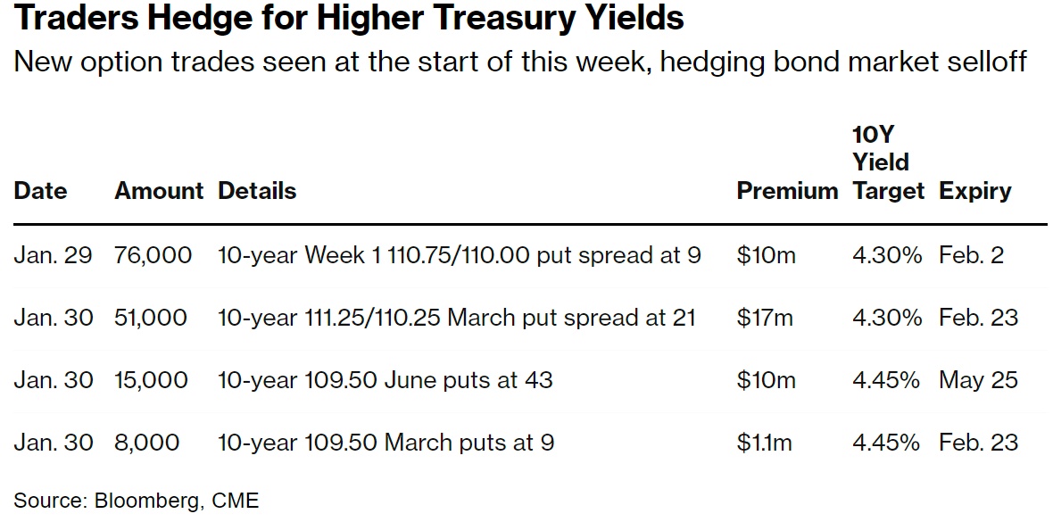 这就是本周迄今美国公债期权的走势。在周三美国公债再融资公告和美联储宣布利率决定之前,支付高额溢价的大量需求在债市蔓延。风险还不止于此,因为本周五还将公布1月份的就业报告。