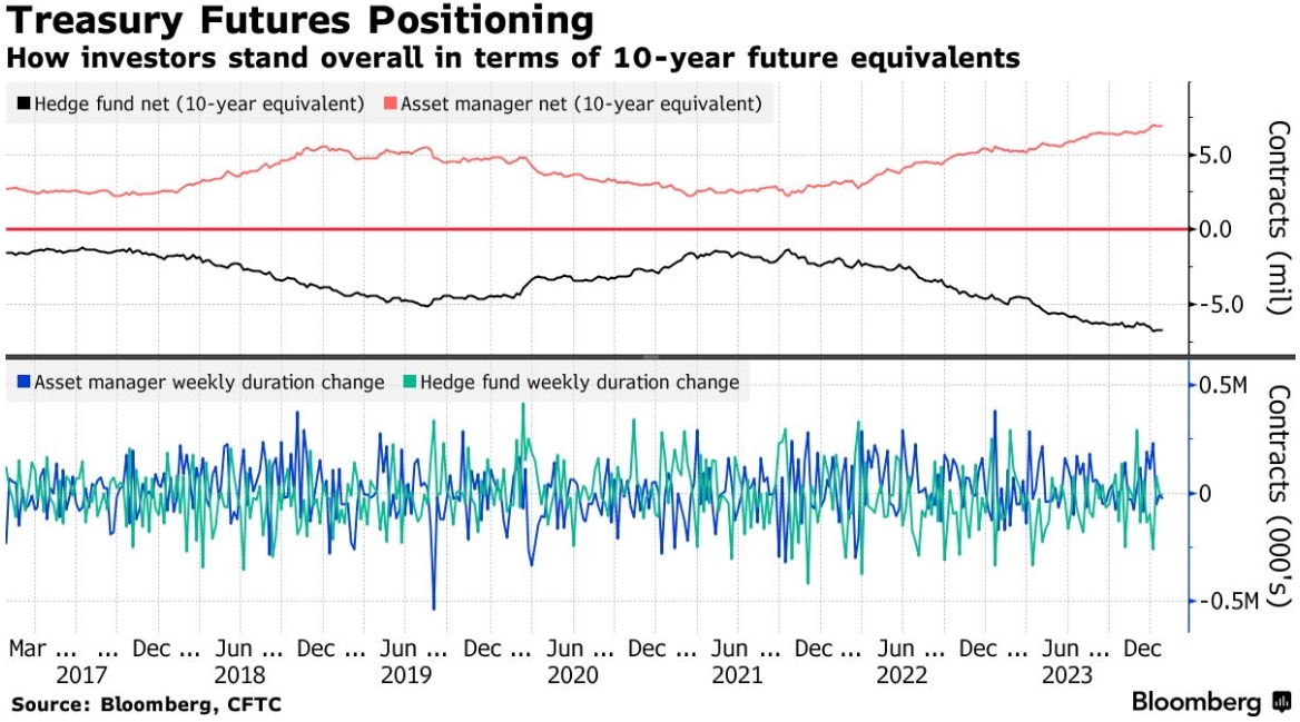 美国商品期货交易委员会(CFTC)截至1月23日当周的数据显示,SOFR期货综合体的仓位仍然存在严重分歧,对冲基金增加了净多头头寸,而资产管理公司增加了净空头头寸。杠杆化的SOFR净多头头寸每一个基点的风险增加约310万美元,而头寸的变化在曲线之外基本没有变化。本周整体久期变化显示,资产管理公司在净多头仓位上加仓2.7万个10年期期货等价物,对冲基金在净空头仓位上加仓1.15万个10年期期货等价物。