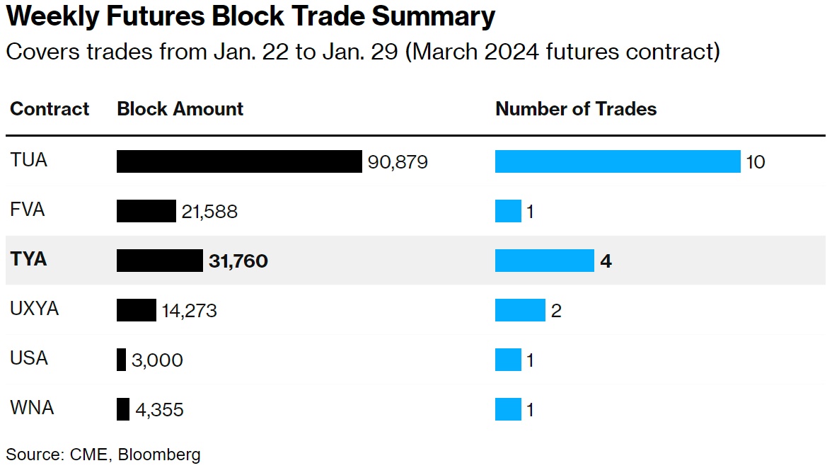 大宗交易继续活跃,过去一周对2年期国债期货的需求显著。周一的行动包括两笔大额2年期大宗交易,每基点风险总计85万美元,未平仓合约似乎表明是空头回补。