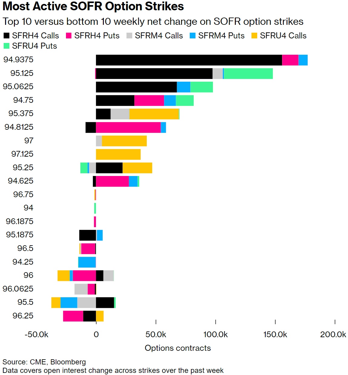 过去一周的期权活动见证了SOFR 3月24日94.9375看涨期权的风险激增,该看涨期权领涨了本周的未平仓合约涨幅。