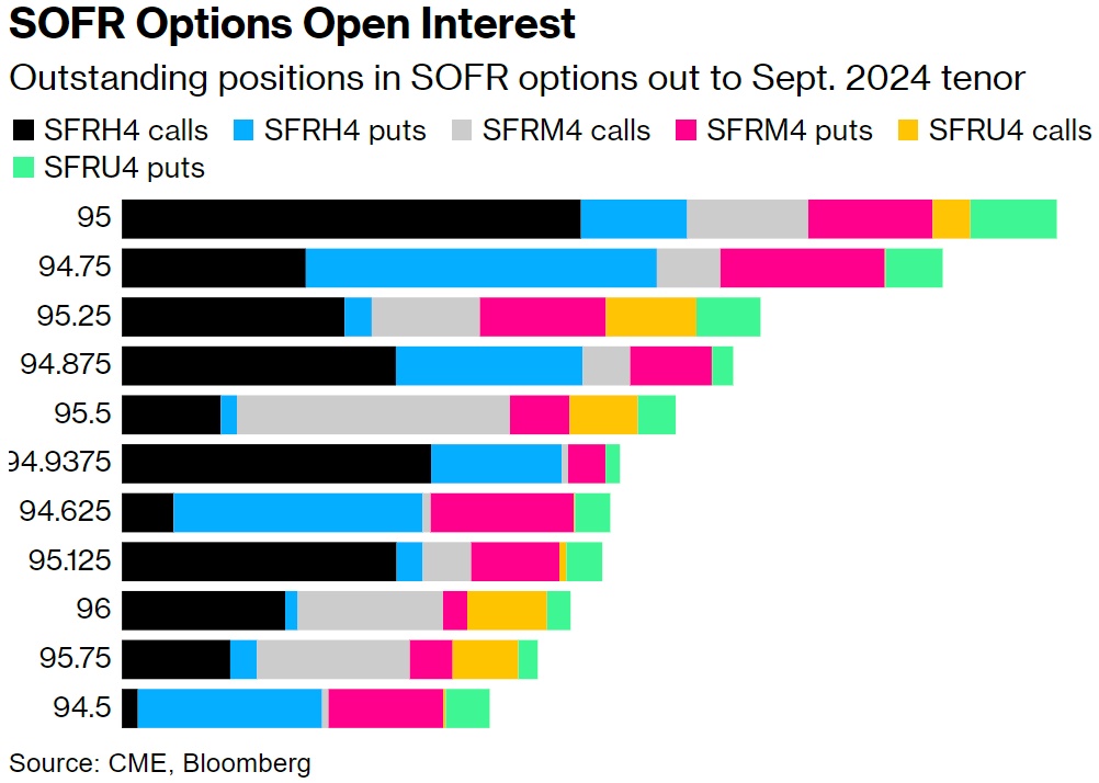 总体而言,截至9月24日的未平仓期权SOFR继续显示,95.00是最受欢迎的行权点,那里有大量的3月24日看涨期权敞口。