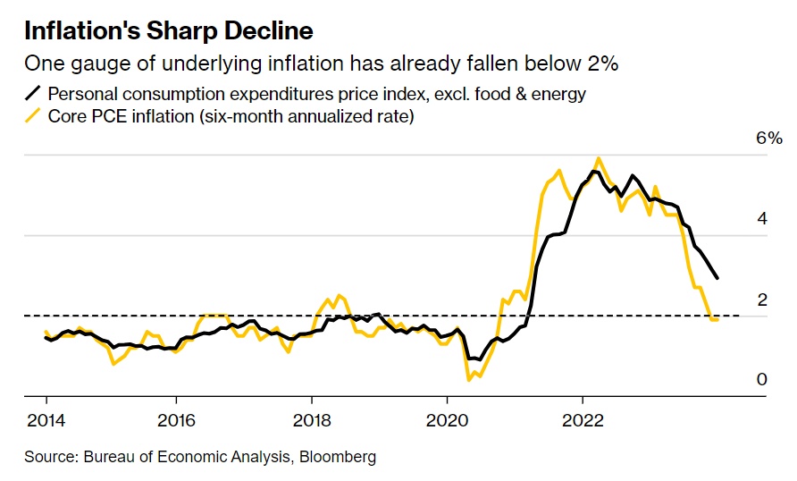 美联储最青睐的衡量通胀指标——核心PCE以近三年来最慢的年率增长,强化了美联储可能将很快开始降息的这一乐观预期。根据美国经济分析局(Bureau of Economic Analysis)公布的最新数据,剔除波动较大的食品和能源成分的核心个人消费支出价格指数(即核心PCE物价指数)去年12月较上年同期仅增长2.9%,低于前值3.2%以及经济学家们预期的3%,自2021年初以来首次降破3%这一重要关口。上周五出炉的通胀报告标志着2023年美国通胀的回落速度远远快于美联储和华尔街经济学家们的普遍预期。