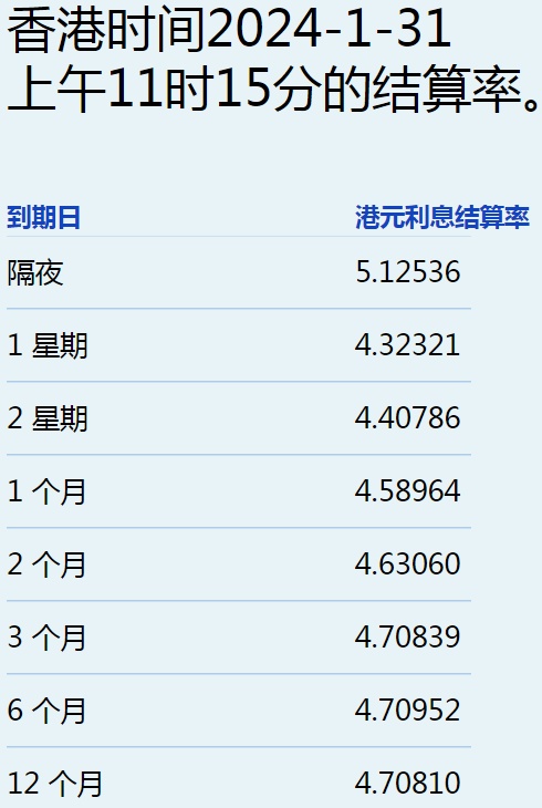 智通财经APP获悉,1月31日,港元两周及以下短期拆息全线上扬,其中,隔夜息再涨71基点至5.12536%,为去年12月29日以来最高。一周拆息亦升至4.32321%。不过,与楼按相关的一个月拆息结束两连升,报4.589642%。反映资金成本的三个月拆息微跌至4.70839%,与同期美元LIBOR息差维持约87基点。六个月及一年期分别跌至4.70952%及4.70810%。