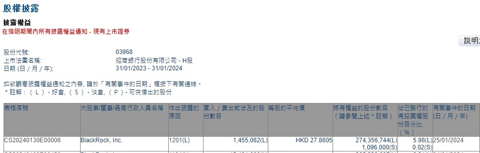 智通财经APP获悉,香港联交所最新资料显示,1月25日,小摩减持招商银行(03968)145.5082万股,每股作价27.8605港元,总金额约为4053.93万港元。减持后最新持股数目约为2.74亿股,最新持股比例为5.98%。