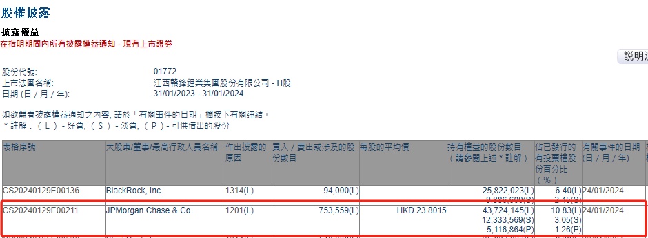 智通财经APP获悉,香港联交所最新资料显示,1月24日,小摩减持赣锋锂业(01772)75.3559万股,每股作价23.8015港元,总金额约为1793.58万港元。减持后最新持股数目约为4372.41万股,最新持股比例为10.83%。