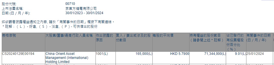 智通财经APP获悉,香港联交所最新资料显示,1月25日,China Orient Asset Management (International)Holding Limited增持京东方精电(00710)16.5万股,每股作价5.79港元,总金额约为95.535万港元。增持后最新持股数目为7134.4万股,最新持股比例为9.01%。
