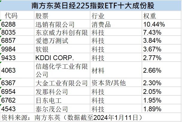智通财经APP获悉,1月31日,香港首个日经225指数ETF——南方东英日经225指数ETF(03153)于港交所上市。该ETF上市价格约为每单位78港元,每手交易单位为10股,管理费为基金净值的0.99%/年。截至今日收盘,该ETF上涨0.42%,全天成交额达4616.37万港元。南方东英日经225指数ETF十大成分股包括,迅销(06288)、软银集团(9984)、大金工业(6367)等。