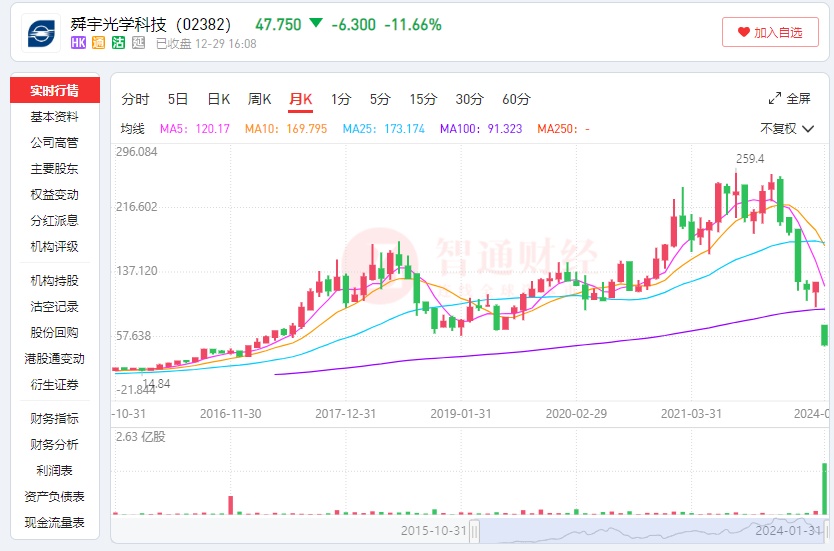 智通财经APP获悉,1月31日,舜宇光学科技(02382)低开低走,午后一度跌超15%,截至发稿,公司股价收跌11.66%,报47.75港元,刷新2017年4月以来新低。消息面上,1月30日,舜宇光学科技(02382)发布盈警,预计2023年度公司股东应占溢利约10.835亿元至12.039亿元,较2022年度的24.078亿元减少约50%至55%。