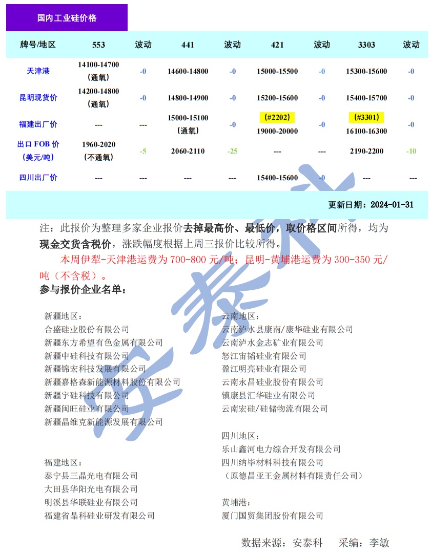 智通财经APP获悉,1月31日,硅业分会发布工业硅周评称,本周工业硅现货价格整体持稳。冶金级工业硅主流价格14100-14800元/吨,化学级工业硅主流价格为15000-15700元/吨。过去一周(1月25日-31日)工业硅主力合约2403收盘价格从13425元/吨震荡波动至13160元/吨,最终下跌265元/吨,跌幅为1.97%。FOB价格下跌5-25美元/吨。临近年关,物流紧张,汽运运费各地区均有不同程度的上涨。近期,下游补库基本结束,询单热情降低,整体市场成交量减少,成交清淡,下游采购观望情绪较浓。