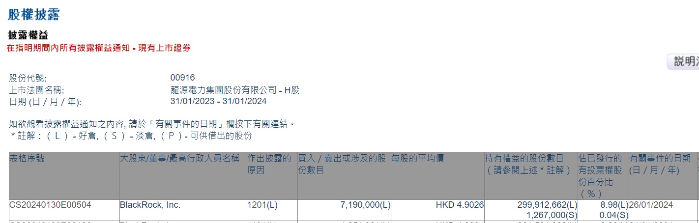 智通财经APP获悉,香港联交所最新资料显示,1月26日,贝莱德减持龙源电力(00916)719万股,每股作价4.9026港元,总金额约为3524.97万港元。减持后最新持股数目约为3亿股,最新持股比例为8.98%。