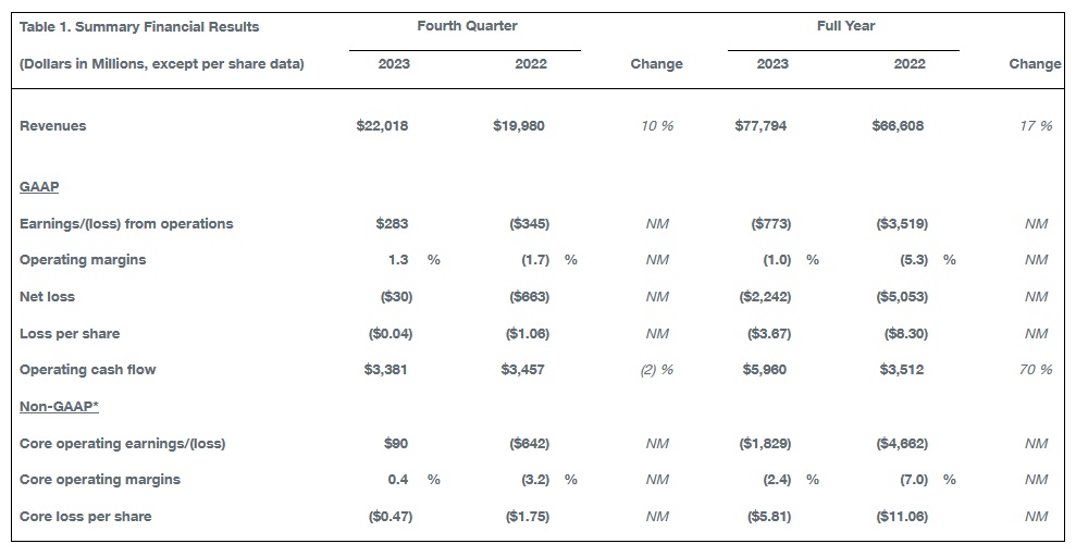 与此同时,财报显示,波音Q4营收同比增长10%至220.18亿美元,好于市场预期的211亿美元;净亏损为3000万美元,上年同期净亏损为6.63亿美元;核心每股亏损为0.47美元,好于市场预期的每股亏损0.78美元。自由现金流为29.50亿美元,好于市场预期的20.9亿美元。