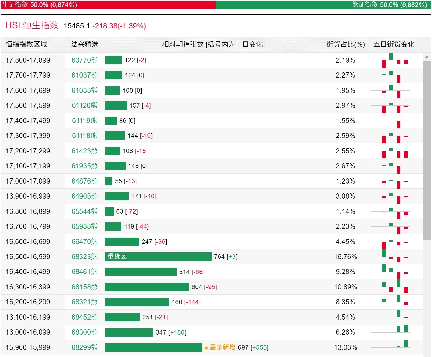 法兴恒指牛熊证街货分布图中的数据显示,熊证街货重货区在16500-16599区间,该区间最新熊证数量为764张,较上一交易日增加3张;最多新增在15900-15999区间,该区间最新熊证数量为697张,较上一交易日增加555张。