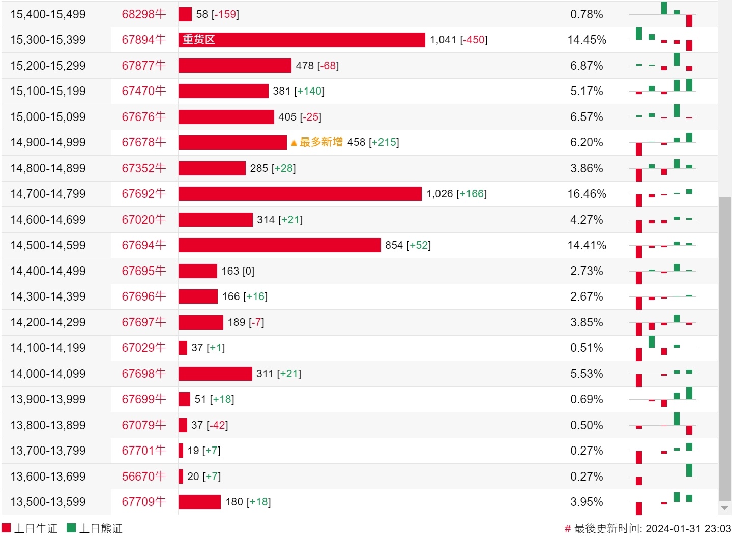 牛证街货重货区在15300-15399区间,该区间最新牛证数量为1041张,较上一交易日减少450张;最多新增在14900-14999区间,该区间最新牛证数量为458张,较上一交易日增加215张。
