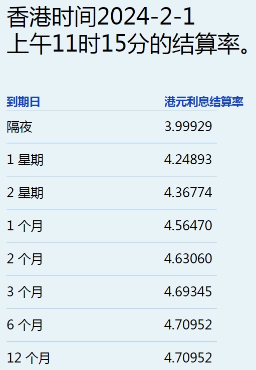 智通财经APP获悉,2月1日,港元拆息普遍下跌,其中,隔夜息由昨日的5.12536%高位急跌112基点,至3.99929%,创近一周新低。与楼按相关的一个月拆息连跌两天,为1月26日以来最低。一周拆息微降至4.24893%。反映资金成本的三个月拆息跌至4.69345%,与同期美元LIBOR息差维持约87基点。六个月期及一年期齐报4.70952%。