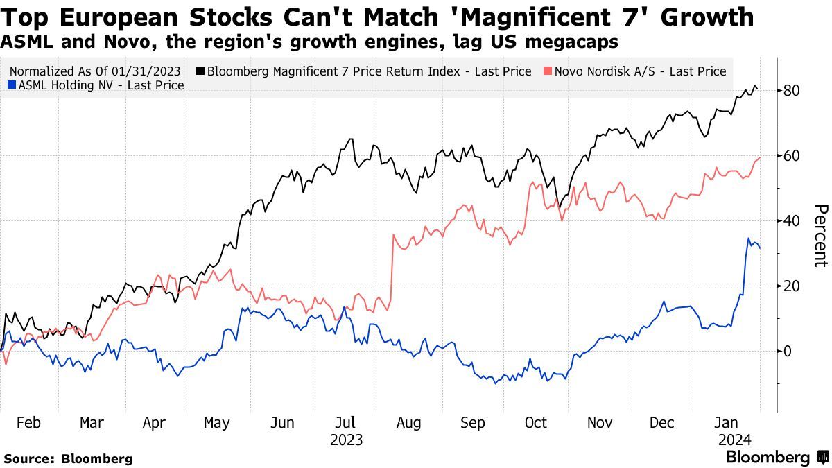 欧洲市值最高的科技公司是阿斯麦,该公司目前的市值约为3500亿美元,其先进的半导体设备被视为全球芯片制造业的关键。但与美股“七巨头”相比简直是小巫见大巫。受人工智能应用需求爆炸式增长的推动,美股“七巨头”的股价在2023年上涨了100%以上。