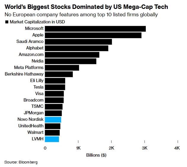 欧洲股市目前仍由增长较慢的银行、大宗商品和消费品类股所主导,诺和诺德和阿斯麦(ASML.US)等公司跻身欧洲大型股之列无疑是一项重大成就,但相比之下,美国股市中那些光鲜亮丽的科技股的扩张速度要快得多。