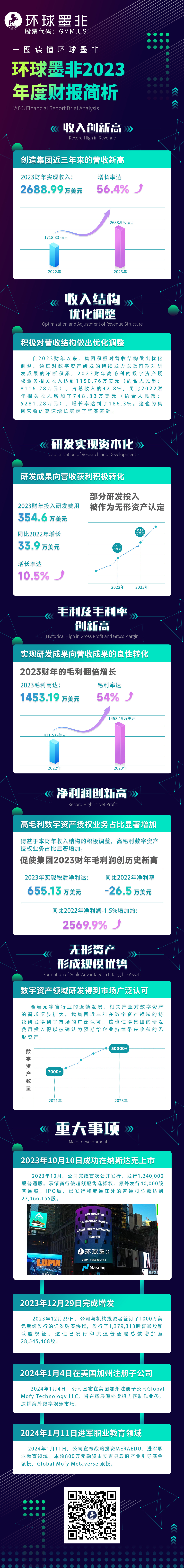 环球墨非(GMM.US)公布的2023年度财报显示,收入增长56.4%至2688.99万美元,创近三年来新高;得益于本财年收入结构的积极调整,高毛利数字资产授权业务占比显著增加,毛利翻倍增长至1453.19万美元,创历史新高;毛利率达54%;税后净利达655.13万美元。