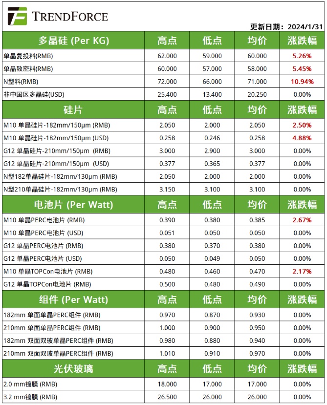 供给侧看,本月电池片厂商均有大面积减产预期,预计实际排产落在40-43GW区间段,月环比持续下行。自23Q3后电池片价格击穿厂商盈亏线后,电池片环节整体盈利状况堪忧,梳理电池片环节各厂商业绩预告看,P型电池产能包袱较重厂商,23Q4普遍亏损严重。考虑到24年海内外均有P型订单需求交付,故P型高效片的需求实际上仍有刚性支撑;Q4以来,大部分厂商停产止损后,P型产出有限,综合来看,预计节后P型交易情绪将出现反转。而因切电、盈利恶化等因素,N型电池在2月份预计会出现较大面积减产,但下游需求同步收缩下滑,整体并未出现供给紧张情况;考虑到Q1需求低迷的情况,预估N型电池片价格走势不甚明朗。
