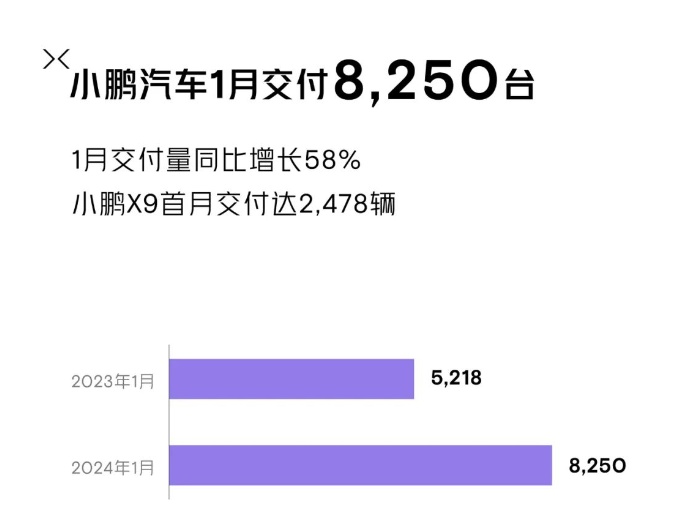 智通财经APP获悉,2月1日,小鹏汽车(09868)公布最新交付成绩。2024年1月,小鹏汽车共交付新车8250台,同比增长58%。小鹏X9上市(1月1日)即交付,目前小鹏X9已在全国超100座城市启动规模交付,累计交付达2478台,其中Max版本选购比例近70%。小鹏汽车目前正加紧提升小鹏X9产能,加速交付在手订单。