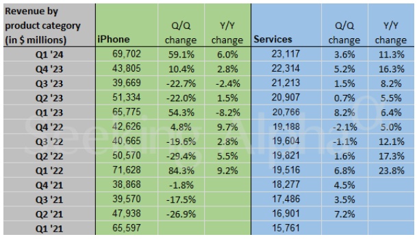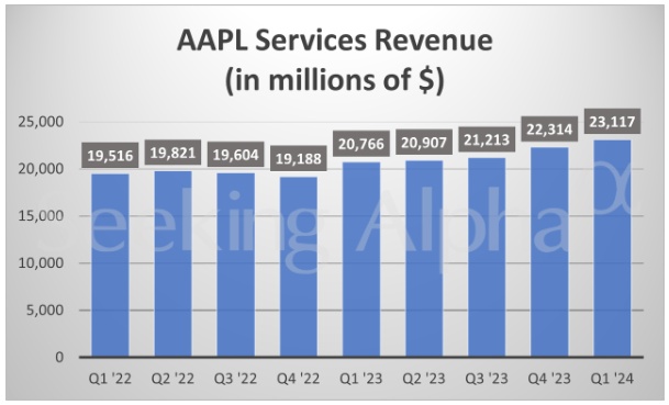 在服务收入方面,该部门本季度带来了231亿美元的收入,比去年同期增长11%。然而,这略低于华尔街预估的234亿美元。尽管增速弱于上个季度的16.3%且不及预期,但连续四个季度创新高,并延续了上个季度两位数百分比的增幅趋势,2023自然年三季度之前曾连续四个季度创个位数百分比的增长。