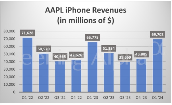值得注意的是,尽管iPhone销量超出预期,且苹果整体收入实现增长,但其在中国市场的低迷状况加剧。具体来说,iPhone营收697亿美元,高于预期的685.5亿美元。但大中华区收入208.2亿美元,同比下降13%,远低于预期的235亿美元,是自2020年第一季度以来,苹果在该亚洲国家12月季度的最弱表现。