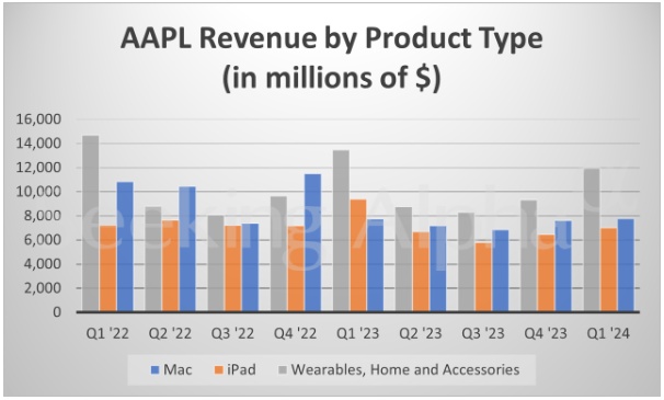 其他硬件中,Mac电脑Q1营收为77.8亿美元,占总营收的10%,同比增0.6%并略高于预期。正如苹果在11月预警的那样,iPad在本季度成为弱势产品,该产品Q1营收为70.2亿美元,同比深跌25%或降超23亿美元,也弱于预期。包括Apple Watch、AirPods和智能音箱的可穿戴设备、家居和配件营收为119.5亿美元,同比下跌11%,但好于市场预期的115亿美元。