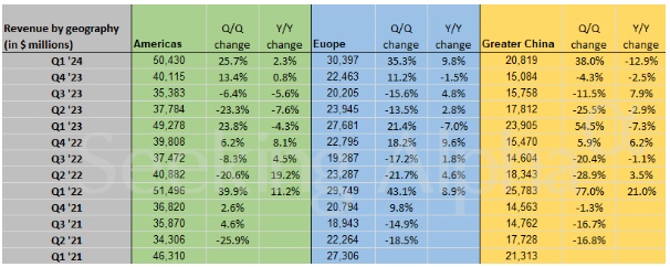 相比之下,苹果最大市场美洲地区的当季收入504.3亿美元,同比增长2.3%,环比增近26%或增加超100亿美元;第二大市场欧洲的收入为304亿美元,同比增9.8%、环比增35%;日本收入77.7亿美元,同比增15%、环比增41%;其他亚太地区收入101.6亿美元,同比增6.6%、环比增超60%。