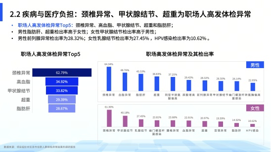 《报告》显示,职场人高发体检异常Top5为颈椎异常、高血脂、甲状腺结节、超重和脂肪肝,占比分别为62.79%、34.92%、33.82%、29.39%和28.67%。这意味着,约2个职场人中就有1人颈椎异常,3人中即有1人检出甲状腺结节。同时,近四成职场男性有超重风险,女性结节检出率近七成,包括甲状腺结节和乳腺结节。