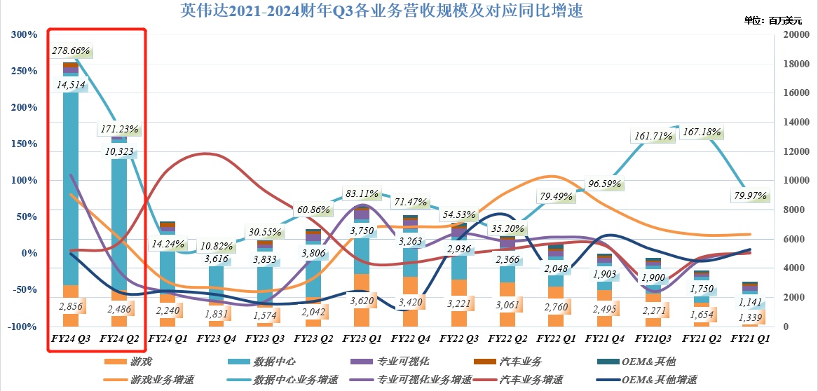 英伟达已成为华尔街最看好的人工智能押注标的,在过去几个季度的所创造的销售额和净利润均大幅超出分析师普遍预期,且连续多个季度提供的业绩展望令华尔街感到震撼。英伟达为全球数据中心提供A100/H100芯片的业务部门——数据中心业务部门,曾经可谓是英伟达“副业”(自英伟达创立之处,游戏业务一直是英伟达的最重要业务),已经成为该科技巨头整体营收的最强大贡献力量。英伟达数据中心业务Q3创造的营收达到145亿美元,较上年同期增长约279%。