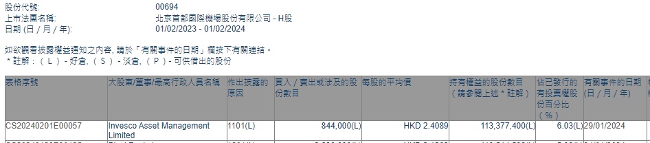 智通财经APP获悉,香港联交所最新资料显示,1月29日,Invesco Asset Management Limited增持北京首都机场股份(00694)84.4万股,每股作价2.4089港元,总金额约为203.31万港元。增持后最新持股数目为1.13亿股,最新持股比例为6.03%。