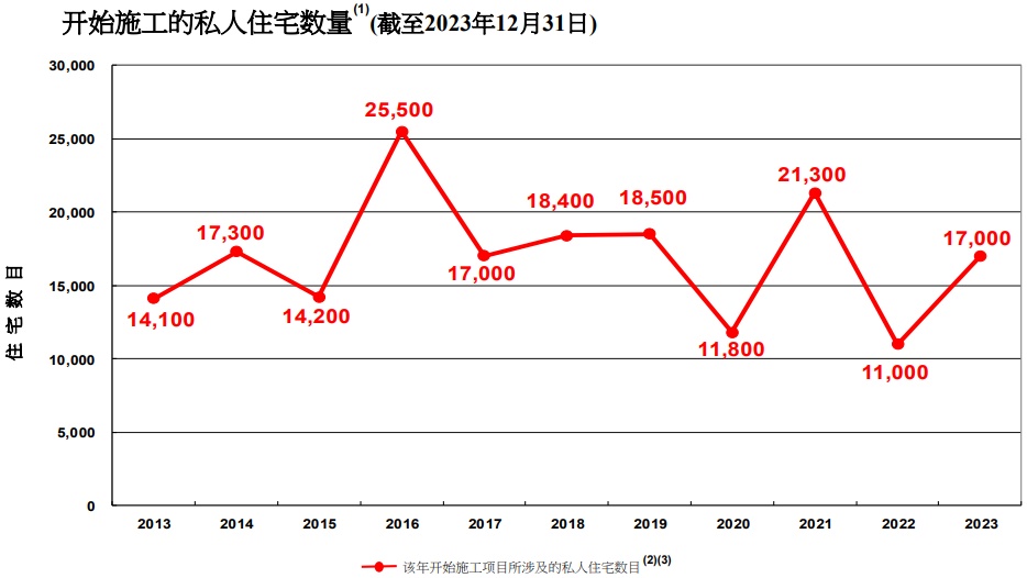 智通财经APP获悉,2月2日,据香港房屋局数据显示,截至2023年12月底,开始施工的私人住宅数量为17000伙,按年增加6000伙;已落成的私人住宅数量为13900伙,按年减少7300伙;已批出而未动工的熟地大约可提供1.8万伙,未来3至4年一手私人住宅大约可提供10.9万伙。