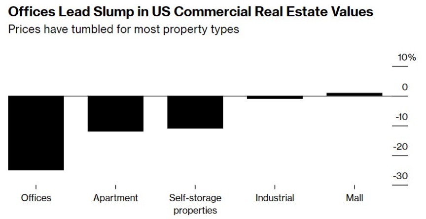 根据为美国国家经济研究局(NBER)准备的一份报告,截至去年第三季度,美国银行持有约2.7万亿美元的商业和房地产贷款。根据NBER的报告,大约14%的商业房地产贷款和44%的办公楼贷款似乎处于资不抵债的状况,这意味着债务大于房地产价值,这增加了借款人不偿还贷款和拖欠贷款的风险。根据分析公司Green Street的数据,自2022年第一季度美联储开始加息以来,美国商业地产价值已经下跌了22%。此外,由于采用远程办公,办公空间需求减弱,写字楼价格下跌了35%。