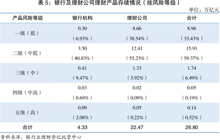截至2023年末,风险等级为二级 (中低)及以下的理财产品存续规模为24.87万亿元,占比92.80%;风险等级为四级(中高)和五级(高)的理 财产品存续规模为0.19万亿元,占比0.71%。