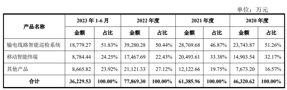 报告期内,公司主要产品包括输电线路智能巡检系统、移动智能终端和其他产品,具体收入结构如下: