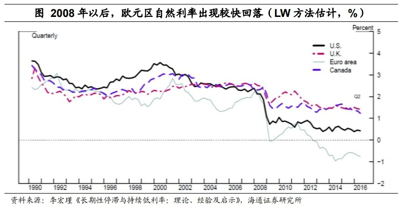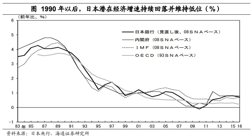 另一方面,尽管日本央行长期维持很低的利率,但对经济的刺激效果却不明显。“零利率”以来(1999-2019),日本实际GDP增速中枢为0.79%,较1990年以前明显回落。同期,CPI同比平均只有0.1%,和2%目标缺口仍大。我们认为,泡沫经济破裂只是利率长期下行的原因之一,实际上,由于人口老龄化加剧、制造业外迁等中长期变化,90年代开始,日本潜在增长率已在较快回落,90年代初4%的潜在增速到90年代末已经下跌至1%左右。与之相伴,自然利率也在回落,因此日本央行实际上是跟随下调了政策利率,并长期维持偏低水平。