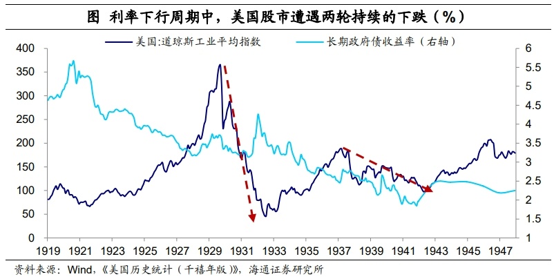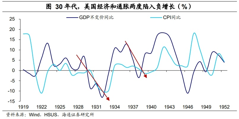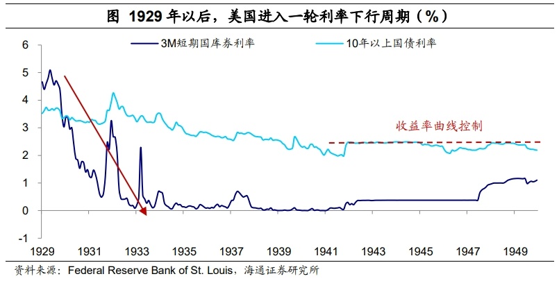 对于美国,除了08年之后的低利率时代,上世纪30年代美国也经历了一波低利率周期。参考短期国库券利率,当时利率高点出现在1929年(5.1%),而后到1933年已降至0.5%以下,并一直保持到1947年。相比于2008年以后的低利率周期(2014年Taper开始),持续时间明显长得多;期间美国还经历了严重的经济衰退和通货紧缩。