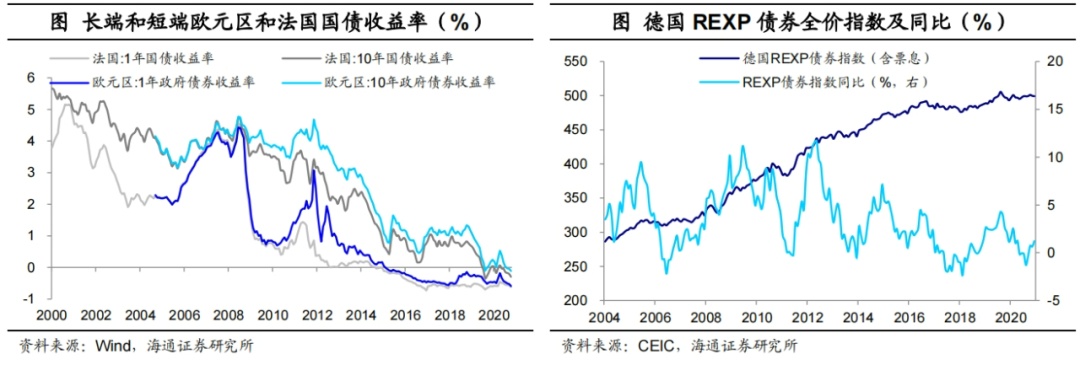 与之类似,2008年以来,欧洲债市整体呈现长牛行情。期间,欧元区10年期政府债收益率长期波动下行,从2008年6月4.8%到2015年4月降至0.78%水平。考虑票息在内,利率快速下行期(2008-2014年),德国REXP债券全价指数年化收益率也可以达到5.5%。
