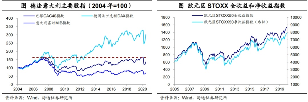 不过随着2011年末降息周期再次启动,欧洲股市也整体触底企稳。但由于经济基本面不同,主要经济体股市表现也趋于分化。比如2008年危机以后,德国依托坚实的工业基础、迅速且有效的刺激方案,实现了经济的较快修复,到2013年DAX指数就已超过2007年时的高点。而像意大利、法国等市场指数尽管呈现持续修复的态势,但回升动力仍显不足。