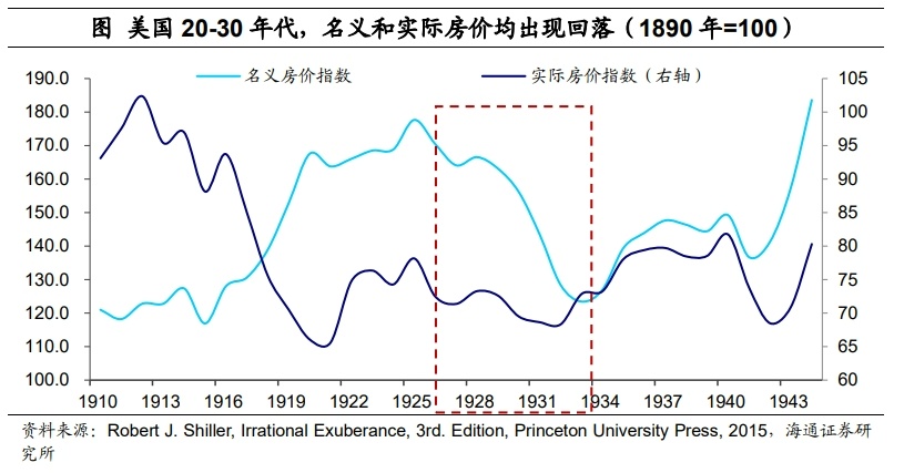 美国20-30年代期间,房地产市场也明显受到经济的拖累,1929年开始名义房价连续5年下跌,累计跌幅达到30%。一直到1944年左右,才恢复到1928年房价水平。