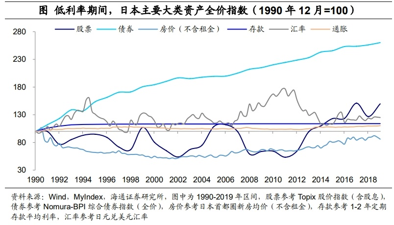 低利率的30年间,对比日本各类资产收益率:债券>股票>汇率>存款>物价>房地产。以1990年底为起始,日本的债券、股指、日元、存款资产到2019年均实现了正收益,且能够跑赢当地的通胀。其中,含票息的债券指数累计涨幅可达160%,约为股票指数涨幅的3.2倍。而商品房价格上,即便是首都圈新房均价也未能回到1990年水平。